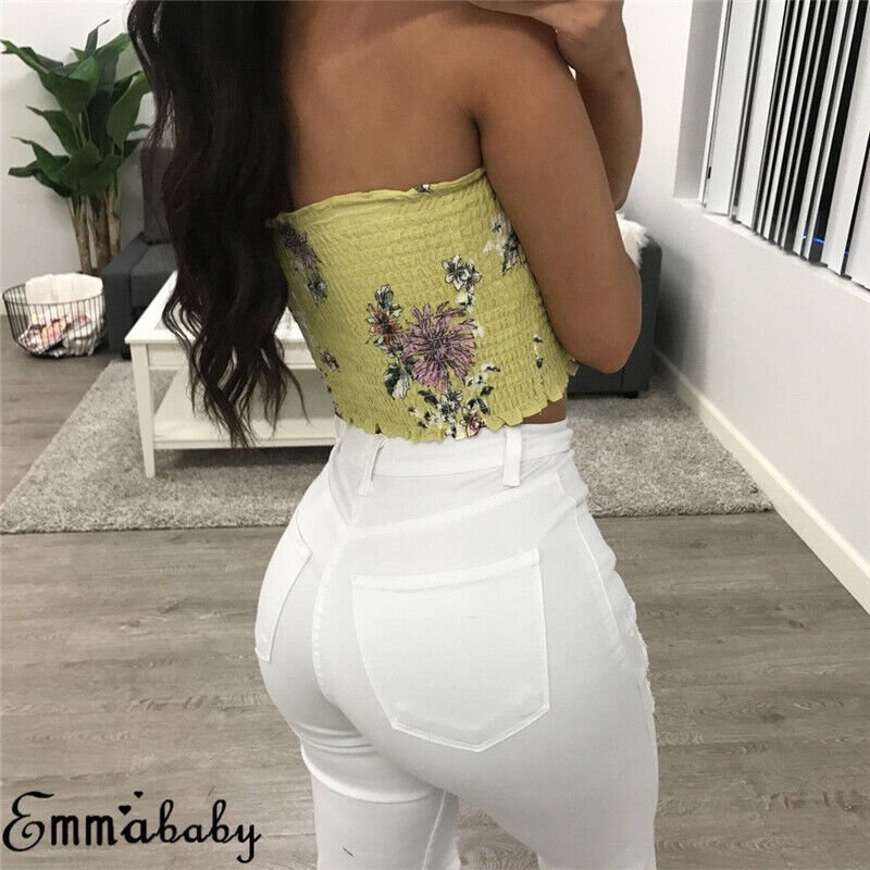 Summer Tube Top Floral Off Shoulder Strapless Bandeau Smocked Ruffle Shirt
